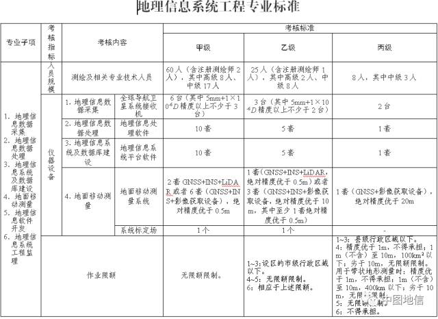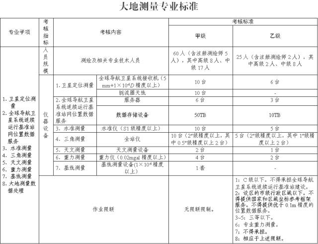 五、省级测绘地理信息行政主管部门可以根据本地实际情况,适当调整各专业标准中乙、丙、丁级的人员规模、仪器设备数量要求。调整后的地方标准,不得高于本标准的高一等级考核条件,也不得低于本标准的低一等级考核条件,不得修改专业范围及专业子项、考核指标和作业限额,不得突破通用标准的规定。调整后的标准应当报送国家测绘地理信息局备案。