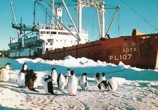 “宗谷号”的第一次南极考察并非一帆风顺,在出发一个多月后的1956年12月底就遇到了暴风(图2),1957年1月29日观测队正式登陆钓钩岛(Ongul Island),并建立了观测基地——“昭和基地”。在回程途中,“宗谷号”被厚冰围困,在苏联破冰船“鄂毕号”救援下摆脱浮冰(图3、4)。