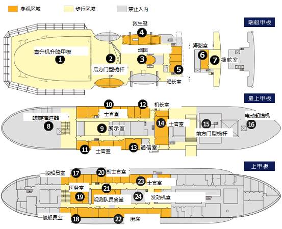 “宗谷号”甲板分三层,内部结构图如图5所示。 4 o$ p1 I; j- y& k