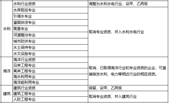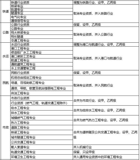 对工程设计资质,取消海洋行业及专业资质,相关企业可以换发相近行业资质;军工行业并入机械行业;取消其他行业的专业资质,并入相应行业资质,原甲、乙级专业资质并入相应等级的行业资质,原丙级专业资质并入乙级行业资质;将专项资质调整为通用专业资质,取消环境工程专项资质的5个专项类别,整合为环境工程专业资质,资质等级压减为甲、乙两级,原丙级资质并入相应专业乙级资质。 ! y4 a5 u' t6 V$ V1 C' ^0 n