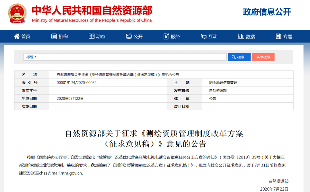 点击上方“溪流之海洋人生”即可订阅哦2020年7月22日,自然资源部官网发布了“关于征求《测绘资质管理制度改革方案(征求意见稿)》意见的公告”。公告指出,这是按照《国务院办公厅关于印发全国深化“放管服”改革优化营商环境电视电话会议重点任务分工方案的通知》(国办发〔2019〕39号),大幅压减测绘领域企业资质类别、等级的要求,以此出台了《测绘资质管理制度改革方案(征求意见稿)》,并面向社会公开征求意见。