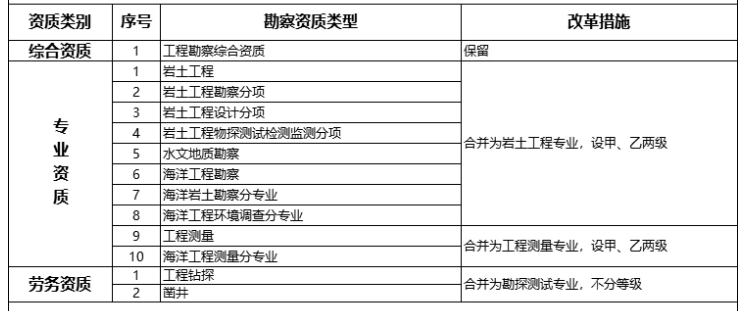 对工程勘察资质,保留综合资质,将4类专业资质及勘察劳务资质整合为岩土工程、工程测量、勘探测试等3类专业资质,专业资质等级压减为甲、乙两级(勘探测试专业资质不分等级),原丙级资质并入相应专业乙级资质。 ! Q" v- }( R; I c8 t) z" q