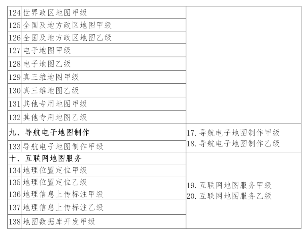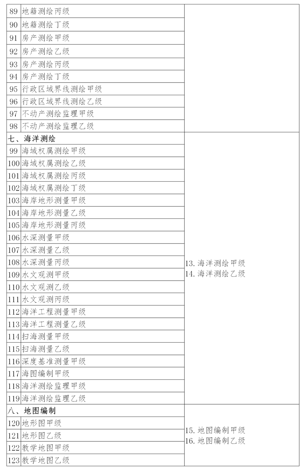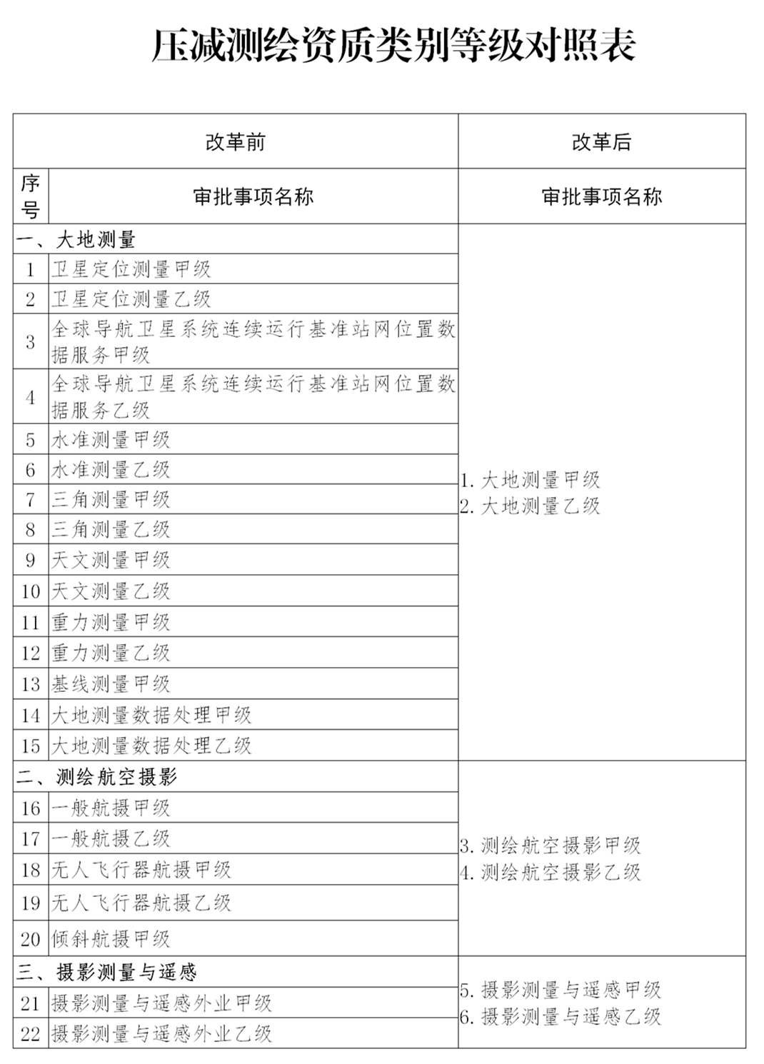 " D" [+ m9 e. Z1 \ 为保持测绘资质管理政策的连续稳定,着眼测绘行业长远发展,基本维持现行政策10个专业类别不变,取消其下设的55个子项,所有子项内容整合至对应的专业类别中;将测绘资质划分为甲、乙两个等级,各专业类别不再设置丙、丁级,新乙级标准基本维持在现行政策各专类别最低等级。改革后,测绘资质类别、等级总数由138项压减为20项,压减85.5%。 ) B7 f- W1 D1 j, ~