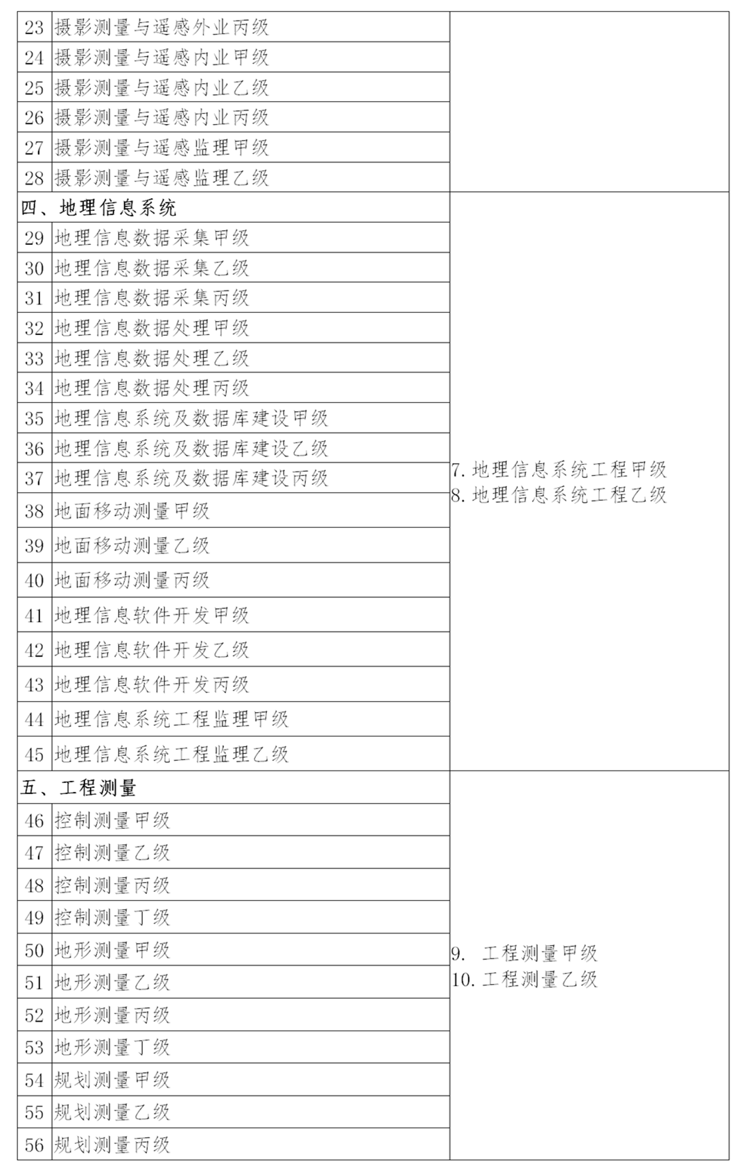 本标准在摄影测量与遥感、地理信息系统工程、工程测量、 不动产测绘、海洋测绘等5个市场化程度较高的专业范围下设置相应的甲、乙级测绘监理专业子项。