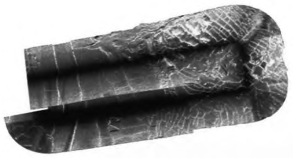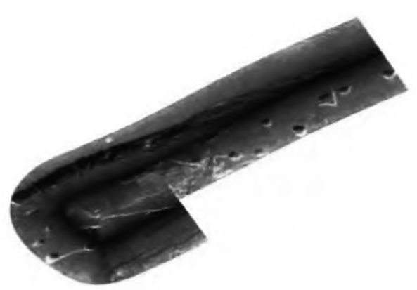 3 ~$ ?& N7 i b1 Z ⑶图像拼接技术:由于侧扫声呐图像条带间是相互独立的,需要基于地理坐标等信息对图像进行匹配,再融合拼接为一个完成且连续的图像,常用基于变换域或空间域的图像拼接技术。图像拼接结果如图4所示,可以看出经过拼接后的图像能够显示海底全局,能够增加侧扫声呐成像的可视化效果。