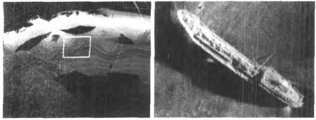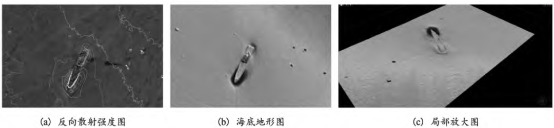 例如,挪威海军曾在霍尔滕外海利用HISAS1030进行三维图像获取,探测区域水深20~120m,探测到一艘二战时期的沉船,结果清晰可见,在航迹向上具有较高的成像分辨率,距离60~140m范围内,如图9所示。