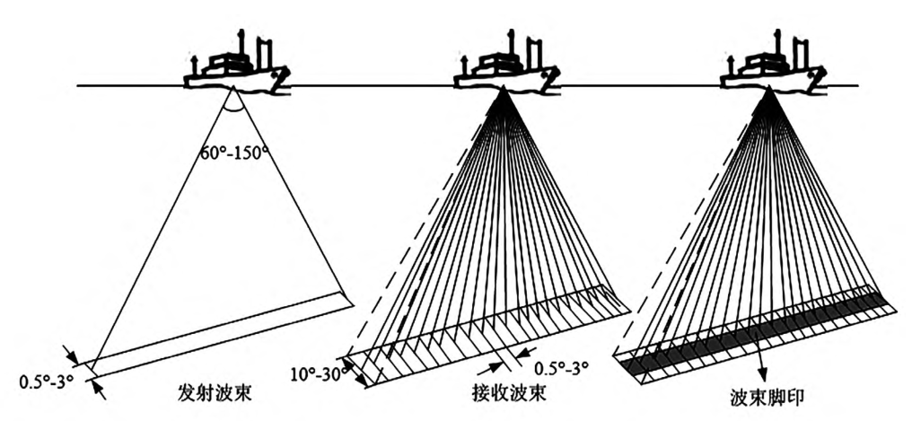 图6 多波束测深声呐工作原理示意图 ' T' { l; ~# U9 y9 K