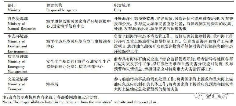 . s) e$ Z" v& r: V# |  1.2 海洋环境突发污染事件预警组织机构分析我国对海洋的管理实行按行业的分类管理,涉海部门较多。经过2018年国务院机构改革,一些部委职能分化组合,原国家海洋局的职能也划归并转,目前仅对外保留牌子。机构改革后履行海洋环境监督管理职能的重要部委主要有自然资源部、应急管理部、交通运输部、生态环境部。重组后的自然资源部虽然对外保留国家海洋局的牌子,但海洋环境保护的职能基本都让渡给了生态环境部,目前还保留海域、海岛、海洋经济、涉外海洋事务等职能。尽管如此,自然资源部下设的司局级单位海洋预警监测司以及直属事业单位国家海洋环境预报中心、国家海洋信息中心,仍然具有海洋环境污染监测和预警的职能,但只占总体工作的很少一部分内容。由于海洋资源(特别是生物资源)、海洋生态深受环境的影响,自然资源部的海洋环境污染监测和预警职能只是手段性、辅助性的,其目的是针对资源与生态从资源和生态保护的角度开展工作。新组建的应急管理部主要是把安监总局以及煤矿安全监察局(煤监局)的职能整合,主要工作是指导安全生产类、自然灾害类应急救援,承担国家应对特别重大灾害指挥部工作,工作重点是减灾防灾、安全生产监管。由于海洋自然灾害(如地震引发海啸)、海上生产作业会引起环境污染,所以应急管理部也有海洋环境保护职能。应急管理部内设的司局级机构安全生产基础司,具有海洋油气、矿产开采的安全生产监督管理职能,工作重点是生产作业过程中发生的溢油或其他污染事件。应急管理部内设的司局级机构应急指挥中心负责拟订事故灾难和自然灾害分级应对制度,发布预警和灾情信息,承担国家应对特别重大灾害指挥部工作,所以对能够引发环境污染的海上生产作业也有应急管理职责。根据三定方案,交通运输部具有牵头组织编制国家重大海上溢油应急处置预案并组织实施,承担组织、协调、指挥重大海上溢油应急处置等职能。职能中提到的重大海上溢油应急处置是指海上运输船舶由于自然灾害或碰撞等海上交通事故发生的溢油应急处置,由交通运输部部属行政机构海事局具体负责。由于原国家海洋局的海洋环境保护职能整合进了生态环境部,生态环境部承担了海洋环境保护的主体职责。根据三定方案,生态环境部负责重大生态环境问题的统筹协调和监督管理,包括牵头协调重特大环境污染事故和生态破坏事件的调查处理、指导协调地方政府对重特大突发生态环境事件的应急、预警工作,负责环境污染防治的监督管理等,工作由生态环境部内设的司局级机构海洋生态环境司整体负责,由直属事业单位国家海洋环境监测中心、中国环境监测总站提供环境监测信息支持,由直属事业单位环境应急与事故调查中心具体执行环境事件的预警、应急及事故调查。各部委的职能如表 2所示。 综上所述,4个重要的部委都有海洋环境应急管理职能,这些部委的内设机构都在以正式的或非正式的方式从事海洋环境突发污染事件的预警工作。由于我国海洋管理的行业管理属性,各部委针对海洋环境应急管理的工作重点和角色不同:自然资源部虽然有海洋环境污染监测和预警的职能,但只是辅助职能,是为海洋生态和海洋资源的保护服务;应急管理部具有海洋石油、矿产开采的安全生产应急管理职能,落脚点在生产作业过程中发生的溢油或其他污染事件;交通运输部承担海上运输船舶因自然灾害或交通事故发生的溢油应急处置;生态环境部重点负责防治海岸和海洋工程建设项目、海洋油气勘探开发和废弃物海洋倾倒对海洋污染的保护工作,承担海洋环境保护的主体职责,牵头重特大环境污染统筹协调和对地方重特大环境污染事故的指导协调工作。生态环境部的海洋环境保护的应急管理职能更具有综合性和全局性。上述涉海部委在海洋环境突发污染事件的应急管理方面虽有所侧重,但由于海洋环境的复杂性,海洋环境与海洋生态、海洋生物资源的相关性,应急管理会关联到多样化的对象和领域。按照行业实施管理,职能分工越细,越会关联到多个部门。例如,自然资源部与生态环境部都具有海洋环境监测、预警职能,应急管理部与生态环境部在海洋石油、矿产开采作业中的污染应急管理职能交叠。另外,当海洋环境突发污染事件类型为复合型事件时,多头管理的问题更为严重。例如,油船碰撞海洋油气勘探开发作业中所使用的固定式平台或移动式平台,导致油气井喷和船舶溢油同时发生,环境、资源、生态都遭到破坏时,自然资源部、生态环境部及交通运输部等部门都有责任参与。应对复合型事件,一个政府部门不可能独自完成,需要多个部门的共同配合。这些部委都是正部级单位,没有隶属关系,由于现代的组织管理遵循的是层级节制的科层制的逻辑,这为海洋环境突发污染事件应急响应合作开展提出挑战的同时,也为前期预警管理的统筹协调带来了困难。1.3 海洋环境突发污染事件预警信息系统分析海洋环境突发污染事件的预警工作最关键的部分便是相关信息的收集、加工、处理和传输,这直接决定海洋环境突发污染事件的预警效果。海洋环境突发污染事件暴发和事态恶化前,相关信息的获取、收集、加工、传递和共享,是迅速做出预警发布并进行应急处理,然后做出响应分级及开展应急处置,