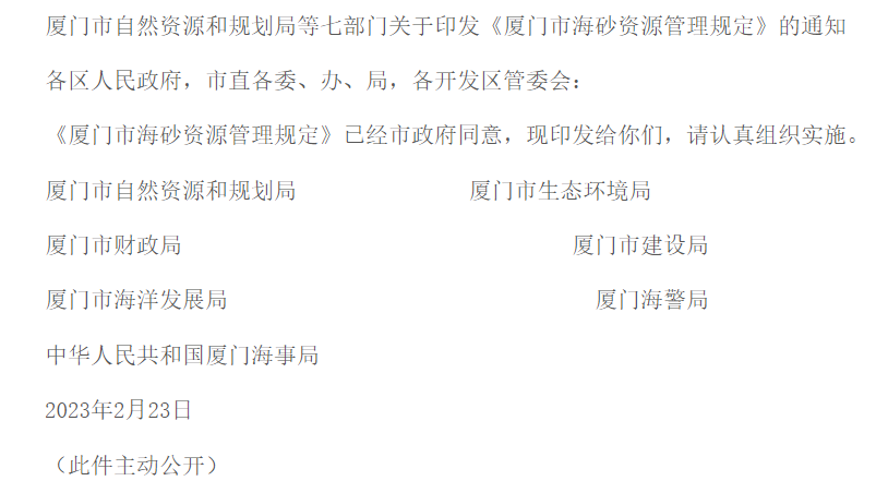为加强我市海砂资源管理,保护海洋资源和生态环境,维护厦门湾口海域海砂开采秩序,根据《中华人民共和国矿产资源法》《中华人民共和国海域使用管理法》《中华人民共和国海洋环境保护法》《中华人民共和国海上交通安全法》《中华人民共和国安全生产法》等相关法律、法规,以及《福建省发展和改革委员会等十七部门关于印发福建省促进砂石行业健康有序发展实施方案的通知》《福建省自然资源厅关于做好海砂采矿权和海域使用权“两权合一”招拍挂出让工作的通知》,结合我市实际,制定本规定。